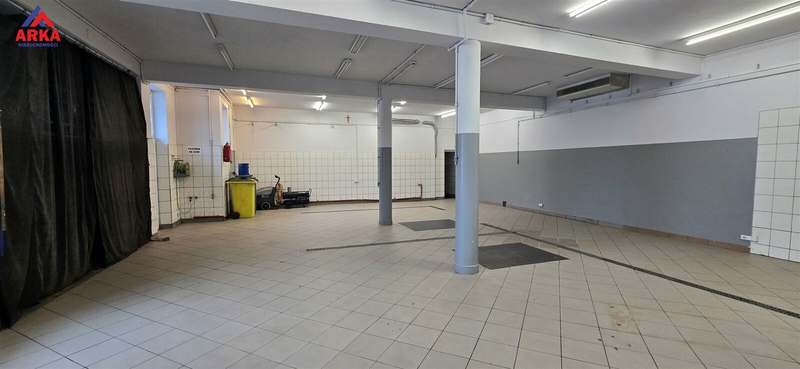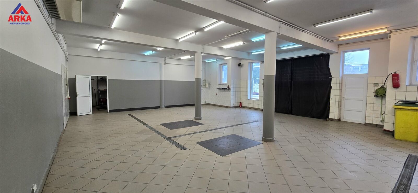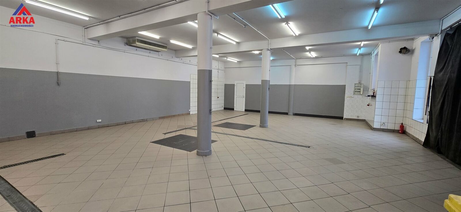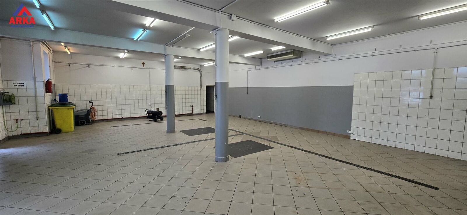Lokal o powierzchni ok. 120 m² składa się z przestronnej hali głównej o wymiarach ok. 12,5 × 9 m oraz zaplecza sanitarnego. Wysokość wnętrza wynosi ok. 3,2 m, co w połączeniu z dwoma dużymi bramami wjazdowymi daje szerokie możliwości prowadzenia różnego rodzaju działalności - również wymagającej swobodnego wjazdu pojazdów lub wózka widłowego.